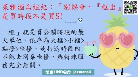 「框」以時段區分:『大框』與『小框』。『大框』需買足公關到下班時間,『小框』最少買足4小時。